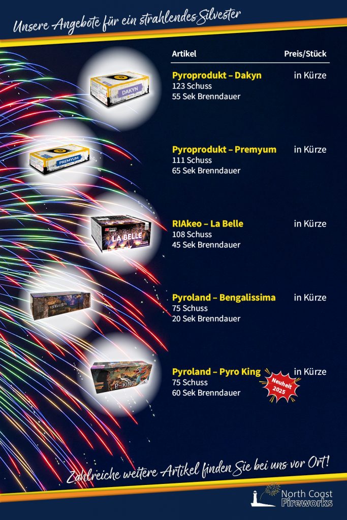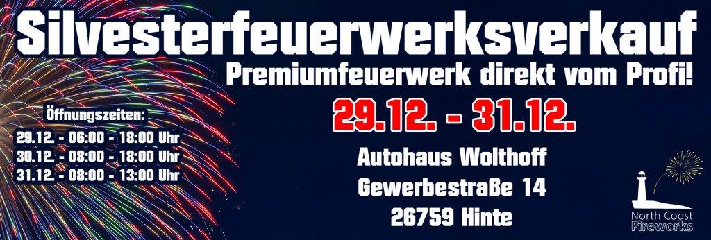 Erlebe den großen Silvesterfeuerwerksverkauf 2025 bei North Coast Fireworks – direkt im Autohaus Wolthoff, Gewerbestraße 14, 26759 Hinte.